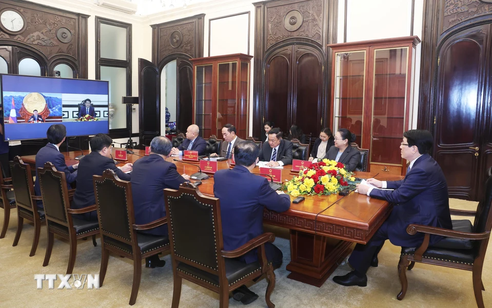 | Chủ tịch nước Lương Cường hội đàm trực tuyến với Tổng Bí thư, Chủ tịch nước Lào Thongloun Sisoulith. Ảnh: Lâm Khánh/TTXVN |